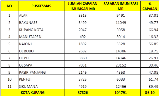 Kegiatan Imunisasi MR pada bulan Agustus dilaksanakan dengan sasaran seluruh Anak Sekolah di Kota Kupang, sedangkan bulan September dilaksanakan dengan sasaran Seluruh Anak Balita di setiap Posyandu atau Pos Pelayanan Imunisasi. Jumlah sasaran kampanye imunisasi MR di Kota Kupang tahun 2018 sebanyak 104,791 sasaran dengan usia 9 bulan kurang dari 15 tahun. Jumlah pos-pos imunisasi MR sebanyak 766 pos, yang nantinya dalam pelaksanaan Imunisasi MR akan dimonitoring oleh pemimpin wilayah setempat dan Juga Tenaga Kesehatan.